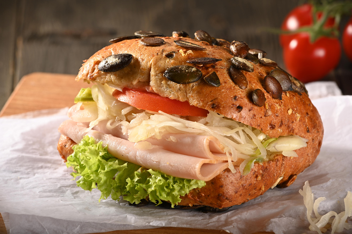 Herzhaftes Kürbiskernbröchten mit frischem Lollo Bionda, Scheiben von Kassler und Tomate, Remoulade sowie Krautsalat.