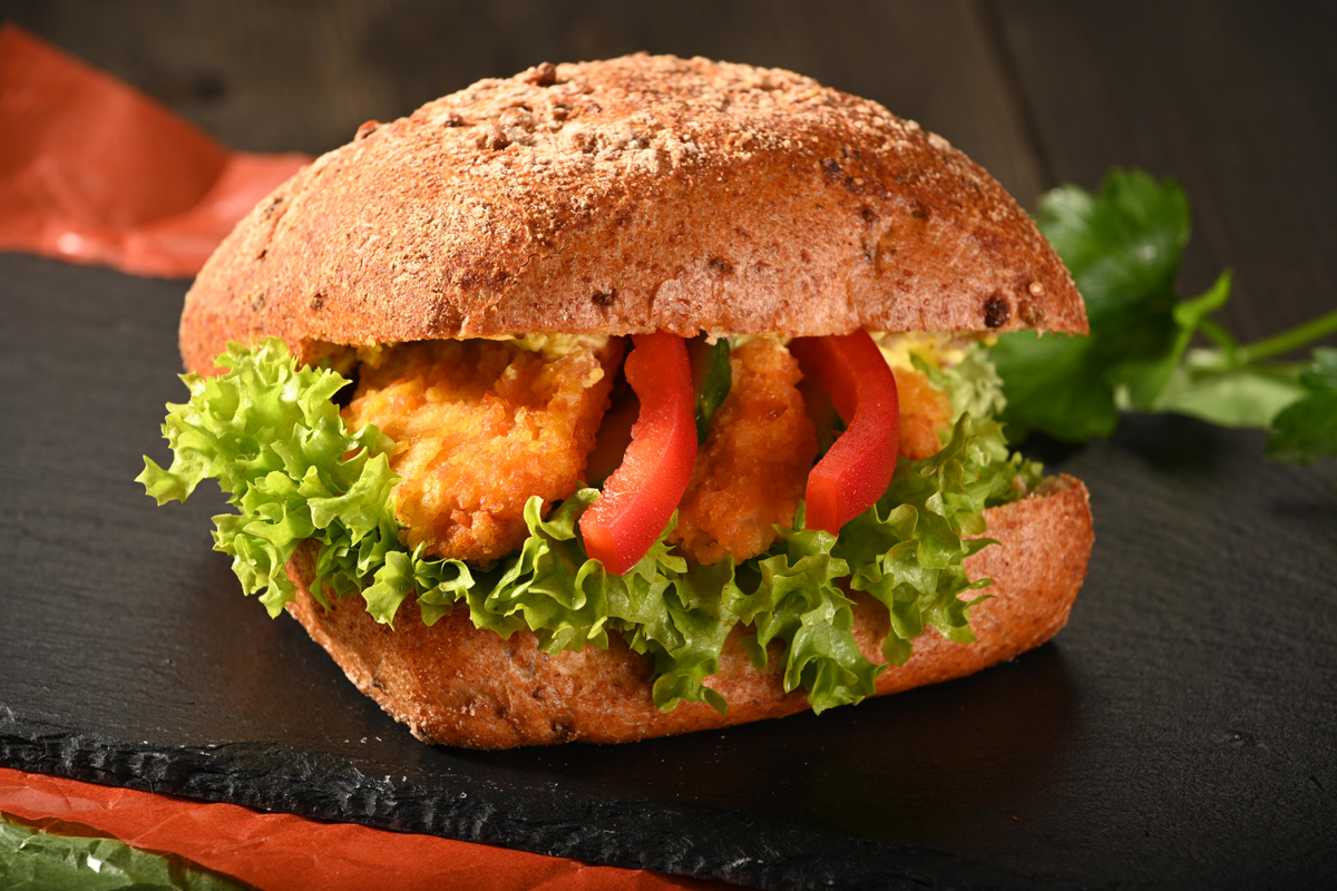 Aromatisches Weizenvollkornbrötchen mit knusprigen Hähnchen-Nuggets, Honig-Senf-Dressing, frischen Paprikastreifen und Lollo Bionda.